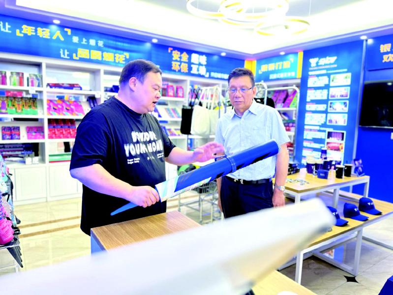银洋城市烟花新零售展厅,何荣强(左)正在为客户介绍新产品。记者张可夫