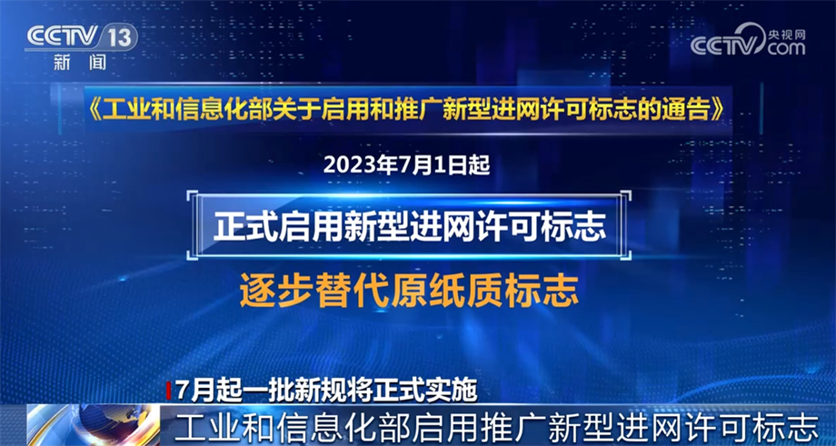 记者29日从工业和信息化部获悉,《工业和信息化部关于启用和推广新型进网许可标志的通告》于近日发布,2023年7月1日起正式启用新型进网许可标志,逐步替代原纸质标志。2024年1月1日起全面推广新型进网许可标志,届时将不再核发原进网许可纸质标志,此前已核发的纸质标志在进网许可有效期内仍然有效,可继续使用。