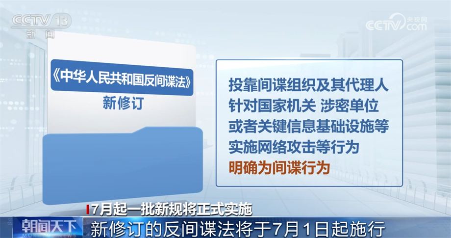 新修订的《反间谍法》将于2023年7月1日起施行。新修订的《反间谍法》将投靠间谍组织及其代理人,针对国家机关、涉密单位或者关键信息基础设施等实施网络攻击等行为明确为间谍行为。在“调查处置”一章中,增加查阅调取数据、传唤、查询财产信息、不准出入境等行政执法职权。