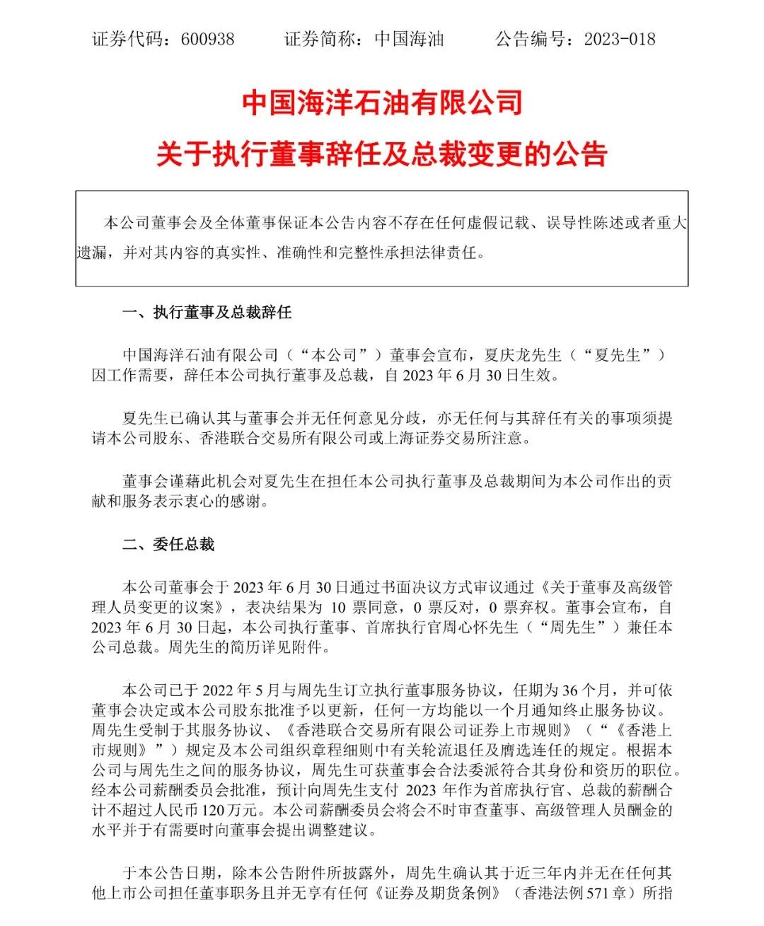 中国海油6月30日发布公告,夏庆龙因工作需要,辞任本公司执行董事及总裁,自2023年6月30日生效。自2023年6月30日起,公司执行董事、首席执行官周心怀兼任本公司总裁。