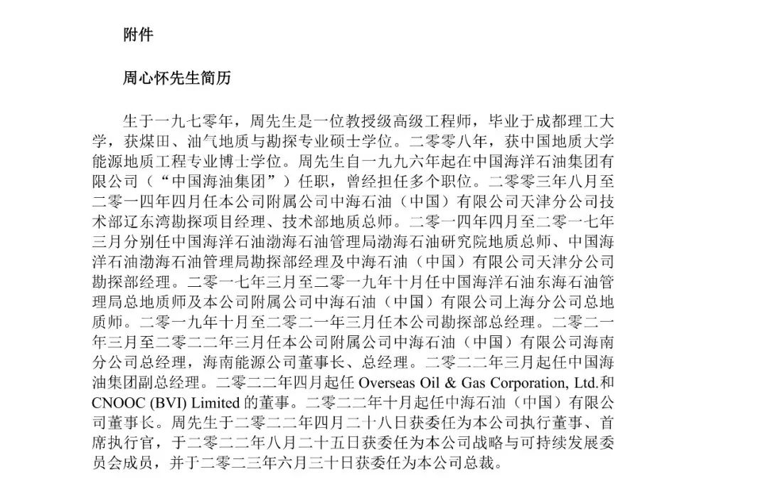 中国能源报微信公号7月1日消息,中国海油6月30日发布公告,自2023年6月30日起,公司执行董事、首席执行官周心怀兼任本公司总裁。