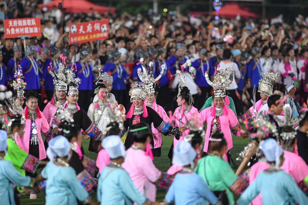 “不同村寨群众的特色表演,不同民族文化的交流碰撞,璀璨的各民族文化为‘村超’添彩。”榕江县民族宗教事务局局长盘英说,“村超”搭建了各民族交往交流交融平台,全县各族群众、全国各地游客共享乡村嘉年华,促进了民族团结和睦。