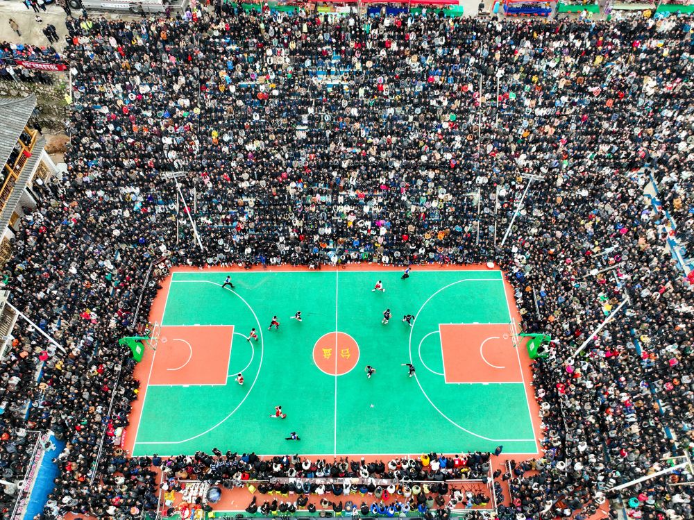 这是3月27日拍摄的贵州台盘“乡村篮球赛”比赛现场(无人机照片)。新华社记者欧东衢摄