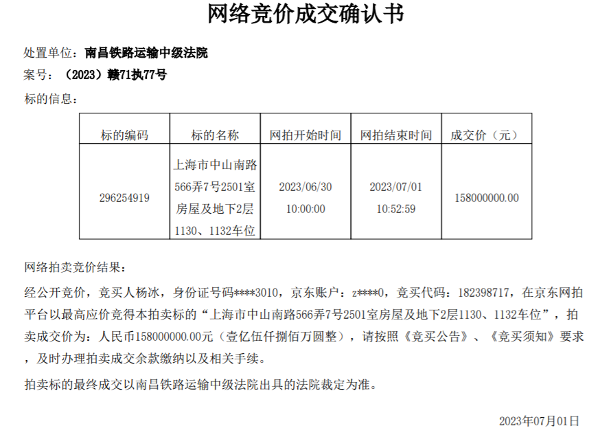京东拍卖的网络竞价成交确认书显示,经公开竞价,竞买人杨冰,在京东网拍平台以最高应价竞得本拍卖标的“上海市中山南路566弄7号2501室房屋及地下2层1130、1132车位”,请按照《竞买公告》、《竞买须知》要求,及时办理拍卖成交余款缴纳以及相关手续。