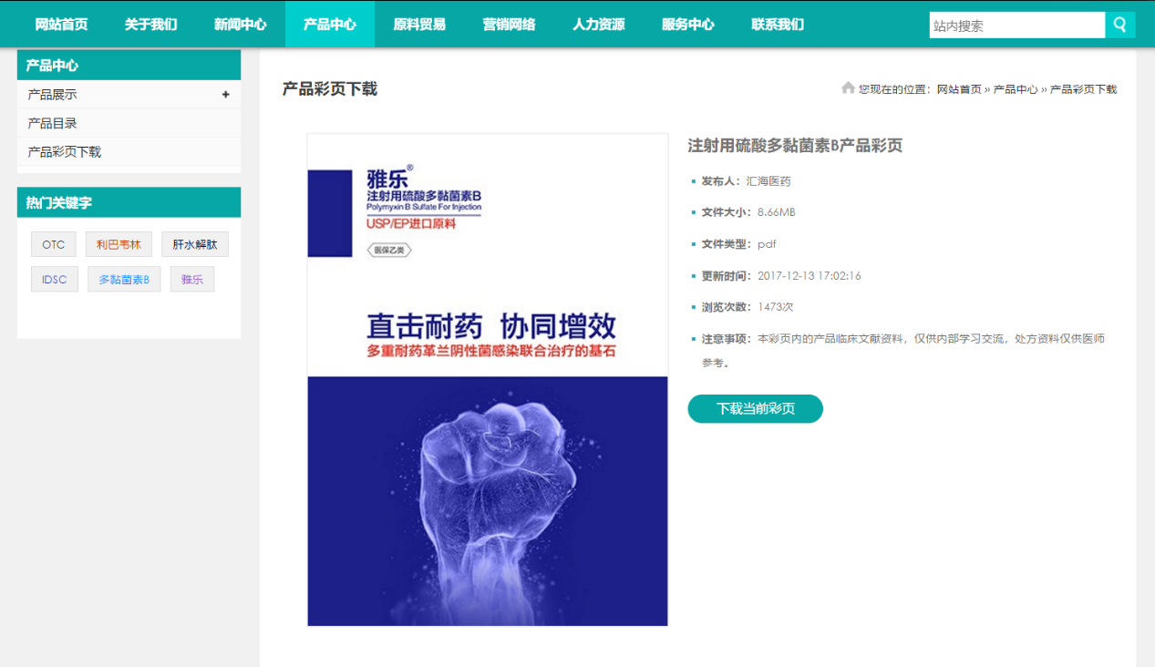 但财联社记者试图下载该彩页时,已经显示无法下载。另外在该公司官网显示的其他经销产品彩页上,都有标注生产企业详情,唯独注射用硫酸多黏菌素B没有写明生产企业,也没有写明武汉汇海医药有限公司的经销权限。