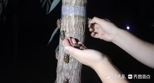进入7月,码头镇前安村的600亩金蝉陆续“成熟”,丰收上市,这金蝉虽小,给养殖户们带来的收益却不小。“今年金蝉好价格,一只能卖到1.3-1.5元,我们前安一天轻松出十万只,老百姓的好日子来啦!”作为合作社负责人,张长合笑得合不拢嘴。从晚上7点多开始,一直到8点多结束,碗口粗细、排列整齐的树上,每棵都爬有知了猴,少则七八个,多则十几个。在每棵树的齐腰部位,都缠着一圈胶带。“这是为了捕捉方便,在树的齐腰部位缠上一圈胶带,胶带表面很滑,知了猴爬到这里就没法继续往上爬了。”张长合介绍道。
