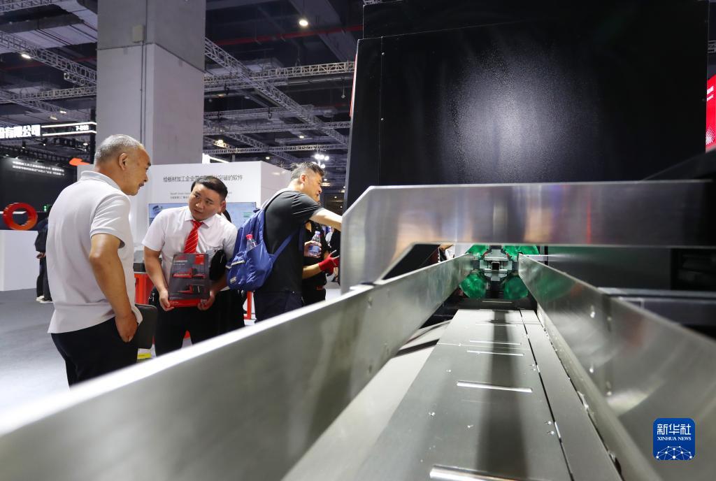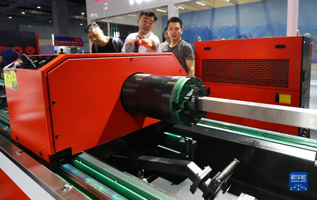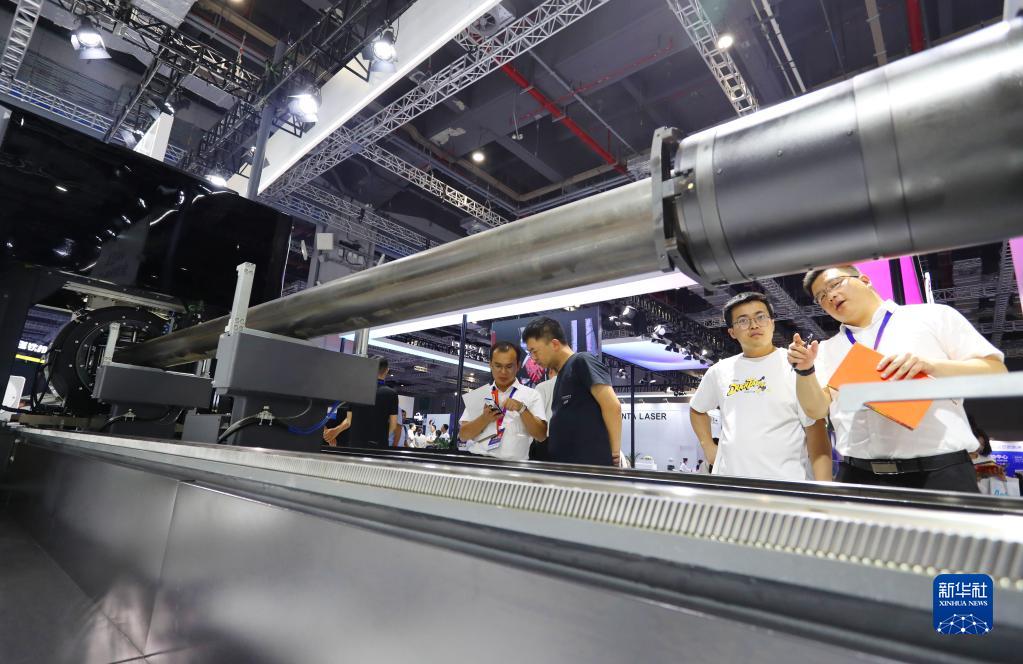 7月5日,参观者在一台进行作业演示的机器人激光焊接机前驻足观看。