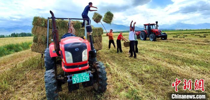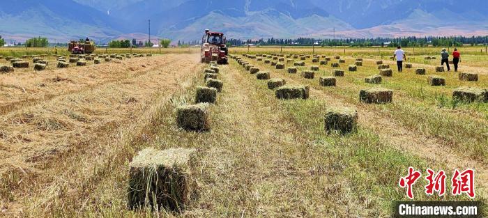 打捆机来回穿梭打捆,牧民忙着拉运打好的机捆红豆草,一派丰收的喜人景象。 华岩明摄