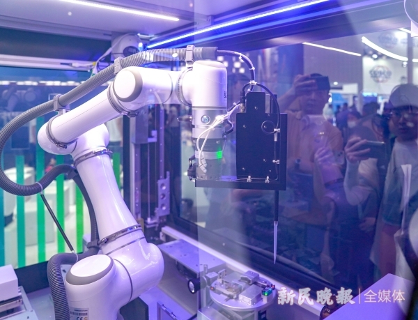 图说:晶泰科技AI药物研发自动化机器人可以在现实中合成AI设计的具有成药潜力的分子,并作测试新民晚报记者陈梦泽摄
