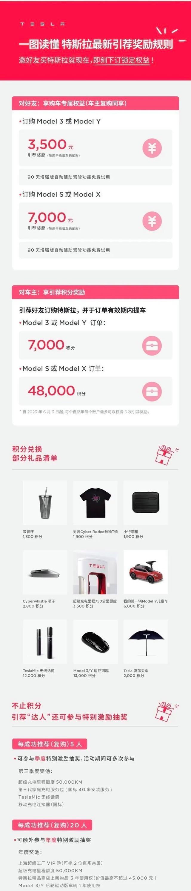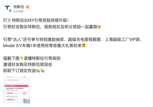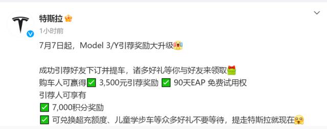 特斯拉官方微博7月7日宣布,7月7日起升级Model 3/Y引荐奖励。成功引荐好友下订并提车,购车人可获得3500元引荐奖励及90天EAP免费试用权,引荐人可享7000积分奖励、可兑换超充额度、儿童学步车等。