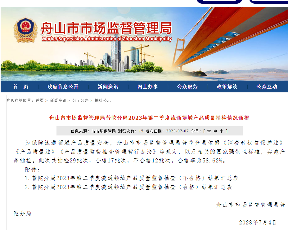 舟山市市场监督管理局普陀分局近日发布2023年第二季度流通领域产品质量抽检情况通报,内容显示,为保障流通领域产品质量安全,舟山市市场监督管理局普陀分局依据《消费者权益保护法》《产品质量法》《产品质量监督抽查管理暂行办法》等规定,以及相关的国家强制性标准,实施产品抽检。此次共抽检 29 批次,合格 17 批次,不合 格12批次,合格率为58.62%。