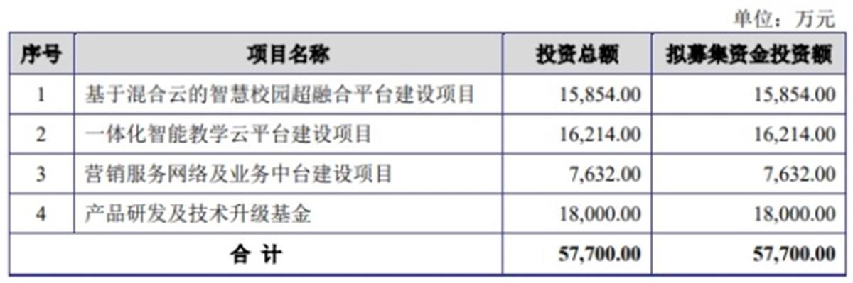 本次IPO金智教育拟在深交所创业板募资5.77亿元,用于“基于混合云的智慧校园超融合平台建设项目”、“一体化智能教学云平台建设项目”、“营销服务网络及业务中台建设项目”、“产品研发及技术升级基金”。