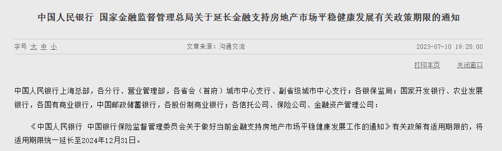 人民银行、国家金融监督管理总局7月10日发布通知称,《中国人民银行中国银行保险监督管理委员会关于做好当前金融支持房地产市场平稳健康发展工作的通知》有关政策有适用期限的,将适用期限统一延长至2024年12月31日。