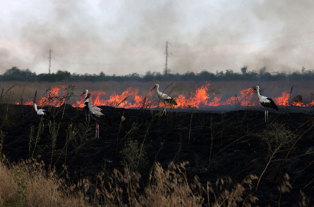 当地时间2023年7月4日,乌克兰尼古拉耶夫州,鹳鸟在斯尼胡里夫卡镇附近被烧毁的田野上走动。视觉中国图