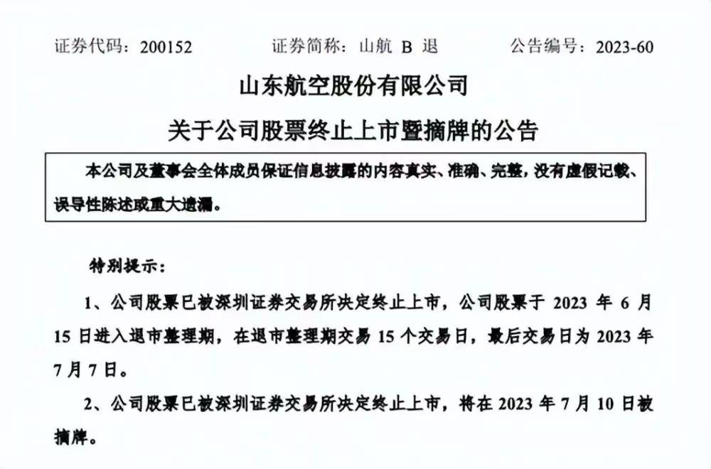 上市23年之后,山东航空迎来了退市终局。7月10日,山航B退公告称,公司股票已被深交所决定终止上市,7月7日是最后一个交易日,于7月10日被摘牌。