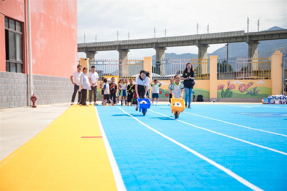 这里的小朋友确是很活泼朝气的。新操场配备了许多功能器材,有着旺盛活力的小朋友们很快就玩得不亦乐乎,探索得七七八八了。这其中有王奇叫得上名字的,像是“跳房子”、拱门、跳马、手忙脚乱器,还有迷你的红绿灯和交通指示牌,可以帮小朋友培养安全意识、提高身体协调能力;也有看小朋友们玩了之后了解的,譬如彩虹伞,原来是让小朋友们协作共同抖动一块极大的彩虹伞面,防止其上的球落至地面的游戏;还有许多圆筒似的、陀螺似的运动器材,她实在见都没见过。葛莎老师也说,“我小学时也是在这边读书,那时候都是矮矮的瓦房,也就在操场上跳跳绳,捡小石头抓子儿。所以我挺羡慕现在的小朋友的,真的很幸福。”