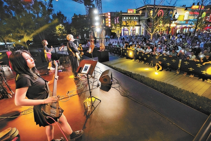 7月第一个周六晚上,在皮爷咖啡与霓虹街市餐厅中间的草坪区域,音乐响起,乐享@城市大道露天乐队表演正式开始。舞台前,游客们高高举起的手机连成一片。在暑期,这样的表演每周六晚都有。7月21日起,每周五晚也将加演。今年已第4次前来消费的北京环球影城年卡用户晓晨说:“有时傍晚才来,要么进去刷两个项目,要么在城市大道看个电影、逛逛街。”灯光、音乐、店铺共同营造出的电影感、梦幻感,让她身心格外放松。