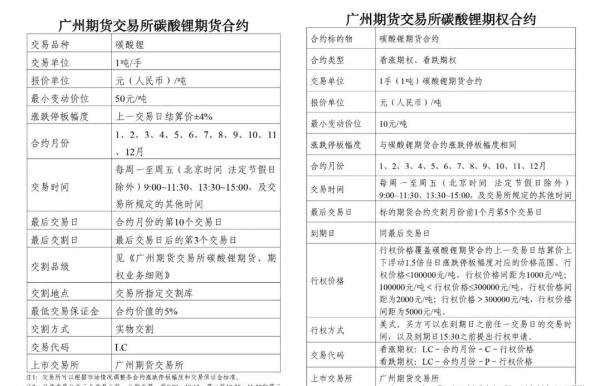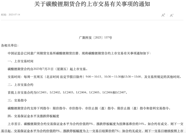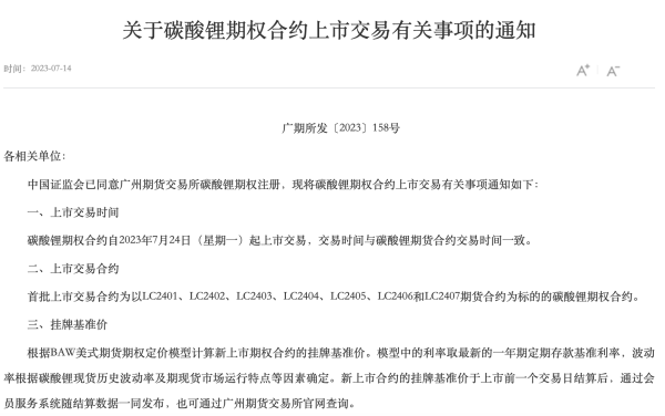 此前7月7日,广期所宣布,中国证监会已同意广州期货交易所碳酸锂期货、期权注册。7月11日,广期所发布《广州期货交易所碳酸锂期货合约》《广州期货交易所碳酸锂期权合约》《广州期货交易所碳酸锂期货、期权业务细则》。