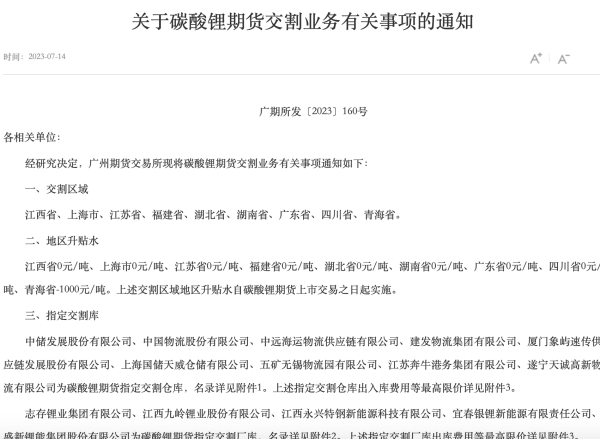 上述交割区域地区升贴水自碳酸锂期货上市交易之日起实施。交割手续费、仓储费:碳酸锂期货交割手续费为1元/吨,仓储费为5元/吨·天。根据广期所发〔2023〕54号,暂免收交割手续费。