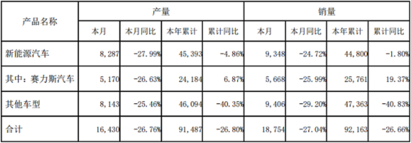 今年上半年,赛力斯销量失去了此前增长的态势。产销快报显示,1-6月赛力斯新能源汽车销量为4.48万辆,同比下降1.80%。其中,赛力斯汽车(目前即为华为与赛力斯联合打造的AITO问界车型)销量为2.58万辆,同比上涨19.37%。赛力斯集团所有车型上半年累计销量为9.22万辆,同比下降26.66%。