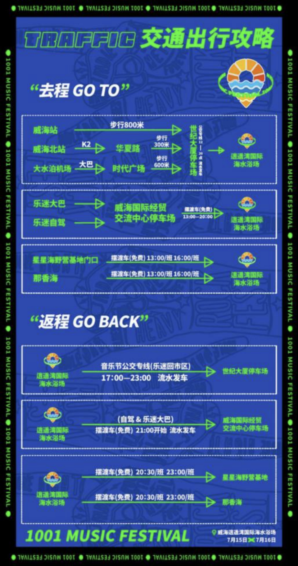 为了保障音乐节期间交通通畅,7月15、16日,逍遥湾国际海水浴场路段禁止停车。为了方便乐迷朋友们自驾前往音乐节场地,组委会专门设置了6处临时停车场,乐迷可以通过百度地图搜索千里山海沙滩音乐节临时停车场导航前往。其中从市区方向来的游客可以搜索停车场,选择1、2、3、4、5号位于威海国际经贸交流中心区域的停车场。丛那香海方向来的游客,可以选择6号停车场,位于滨海大道与海悦路路口东。