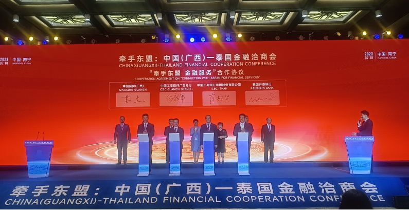 现场举行了“牵手东盟金融服务”合作协议签约仪式,组织举办“面向泰国投资广西”专题推介会、中国(广西)—泰国商业银行业务合作洽谈会等活动。