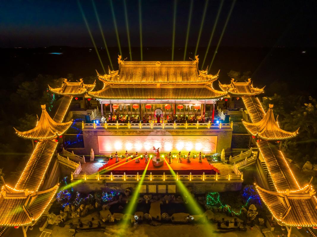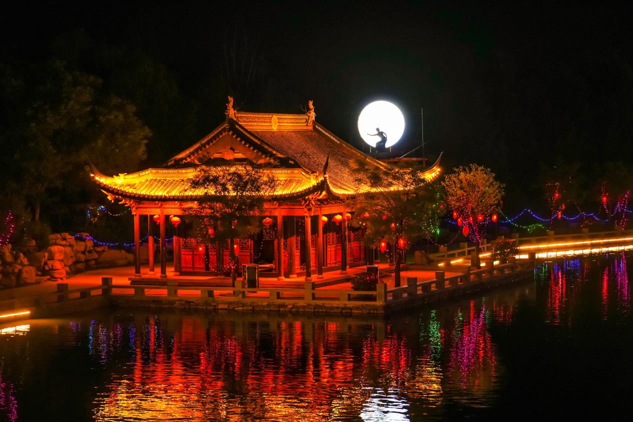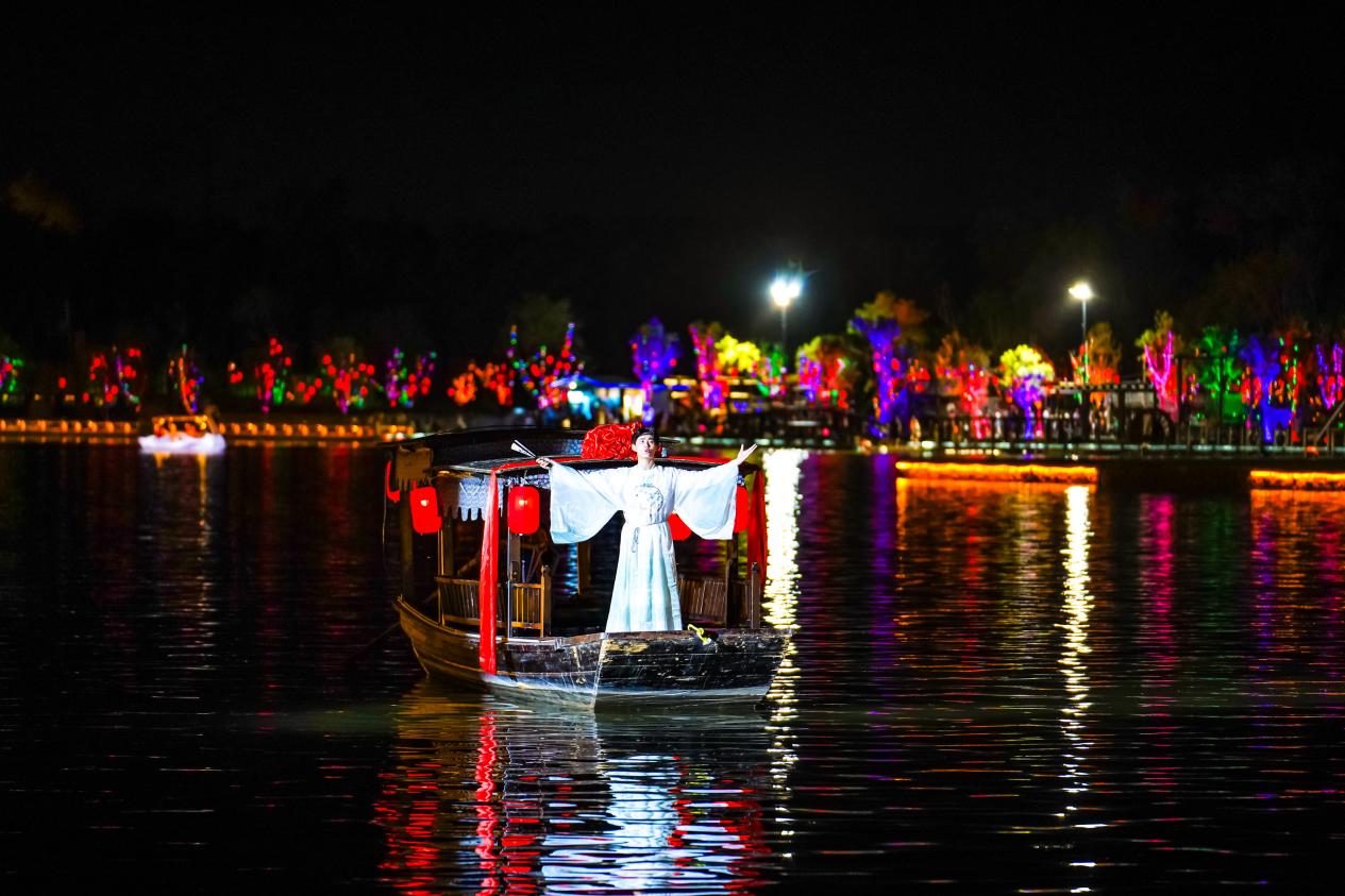 移步演艺广场,《精卫女神》《锦绣霓裳》《飞花漫舞》花灯和表演惊艳了游客的双眼,舞者优美的舞姿与光影相结合,在古典雅致的东宛园里,给人带来虚实结合的视觉享受。
