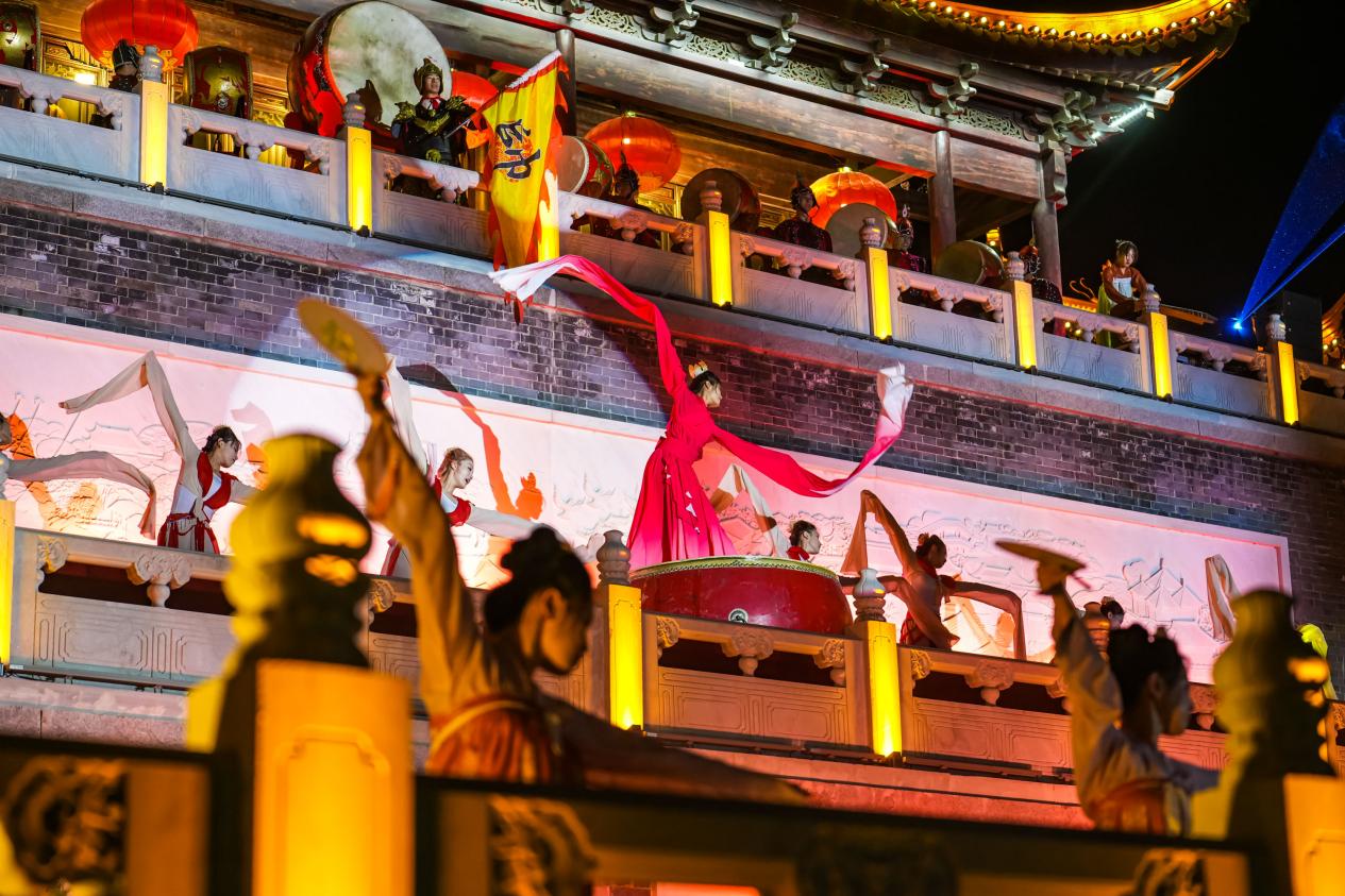 特别值得一提的是,整个夜游活动还为游客准备了重磅演艺——《鼓乐幻城》,数十位演员,大型灯光,多幕设计,实景舞秀……据了解,这台演艺是聊城首台灯光实景鼓舞演艺秀,作为以兰陵笑笑生和《金瓶梅》为主题的演艺,也成为山东首台文学主题的大型实景演艺秀。