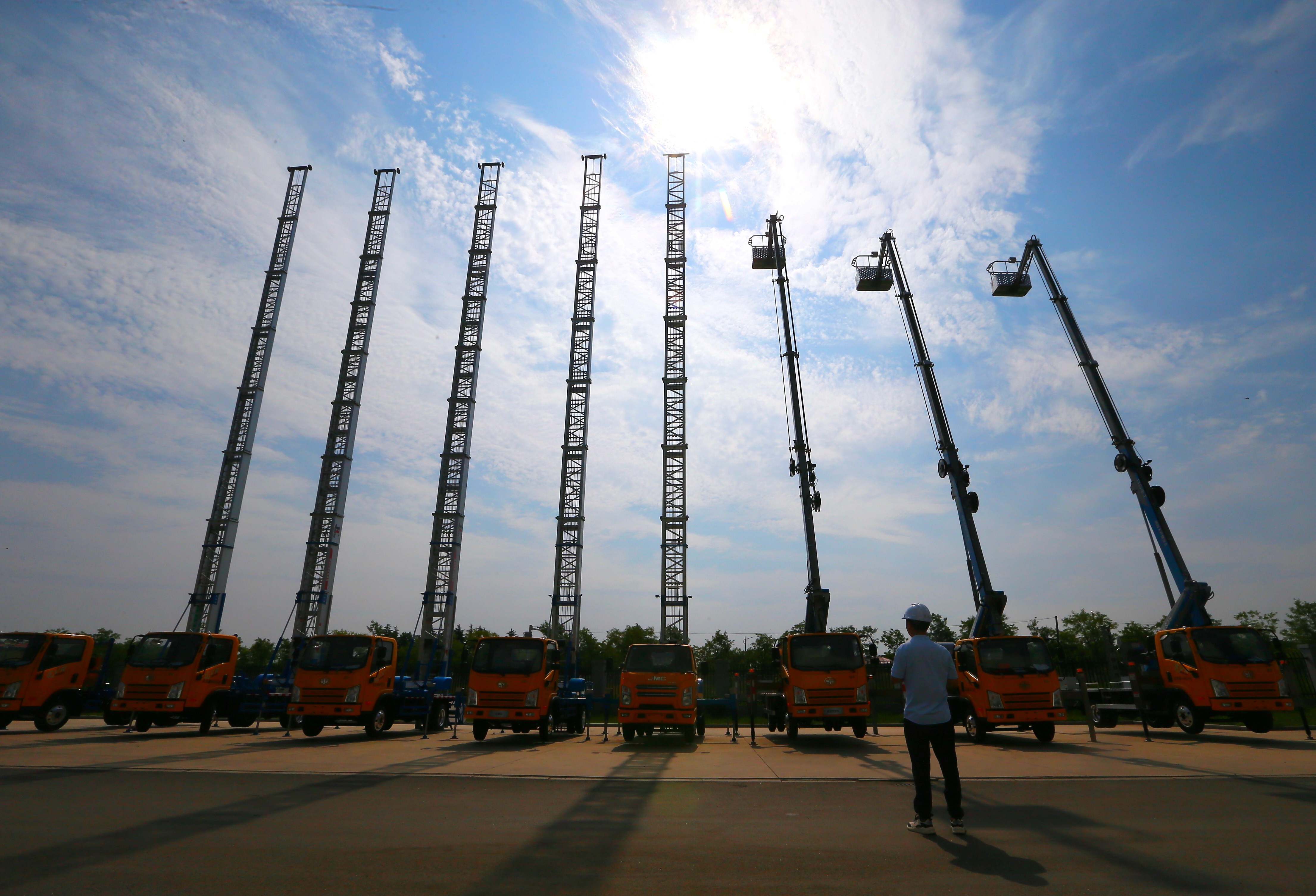 7月20日,青岛九合重工机械有限公司的员工在调试出口到海外市场的云梯车。梁孝鹏摄