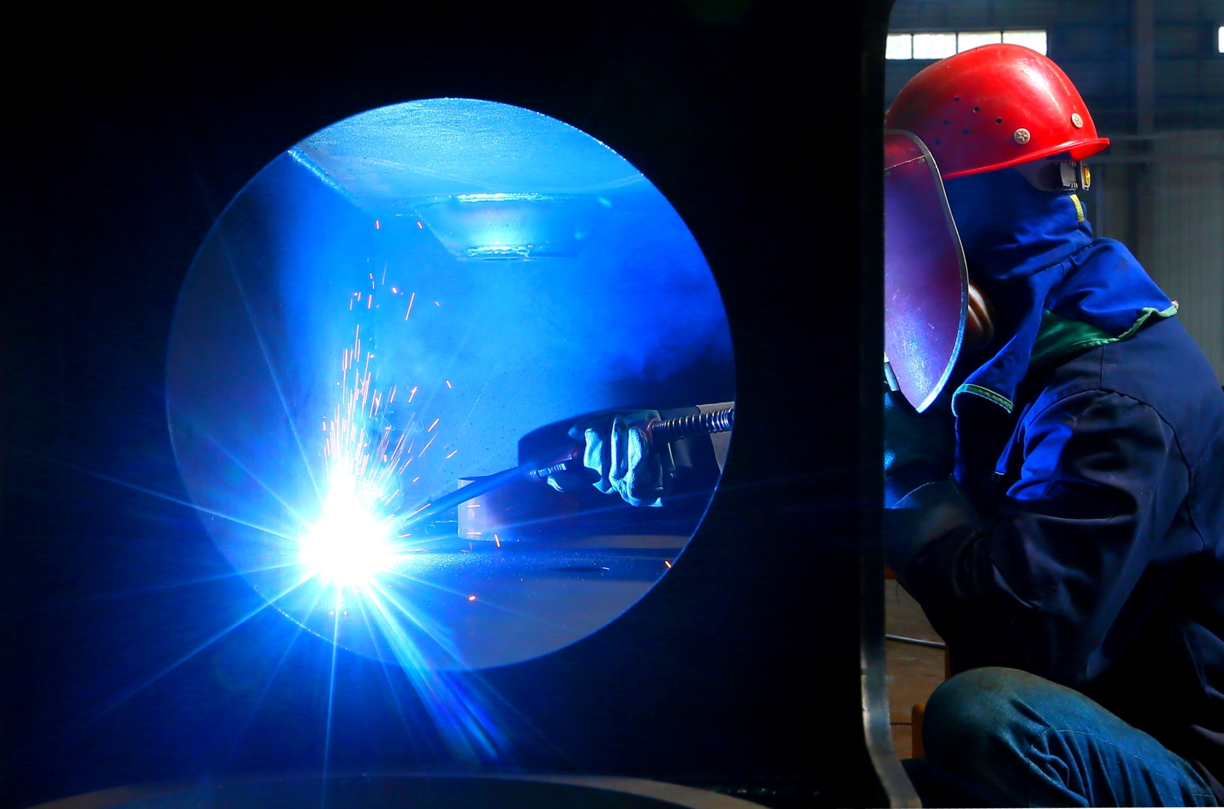 7月20日,青岛九合重工机械有限公司的员工在焊接出口到海外市场的特种车零部件。梁孝鹏摄
