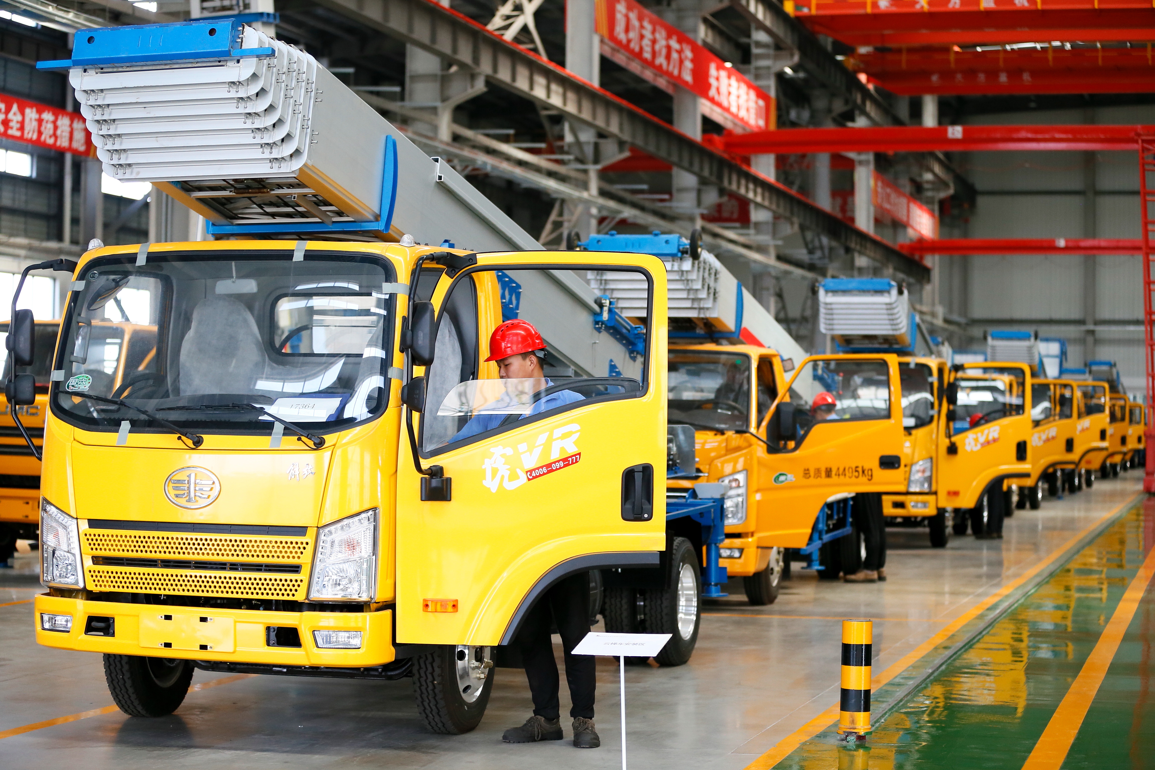 7月20日,青岛九合重工机械有限公司的员工在调试出口到海外市场的特种车。梁孝鹏摄