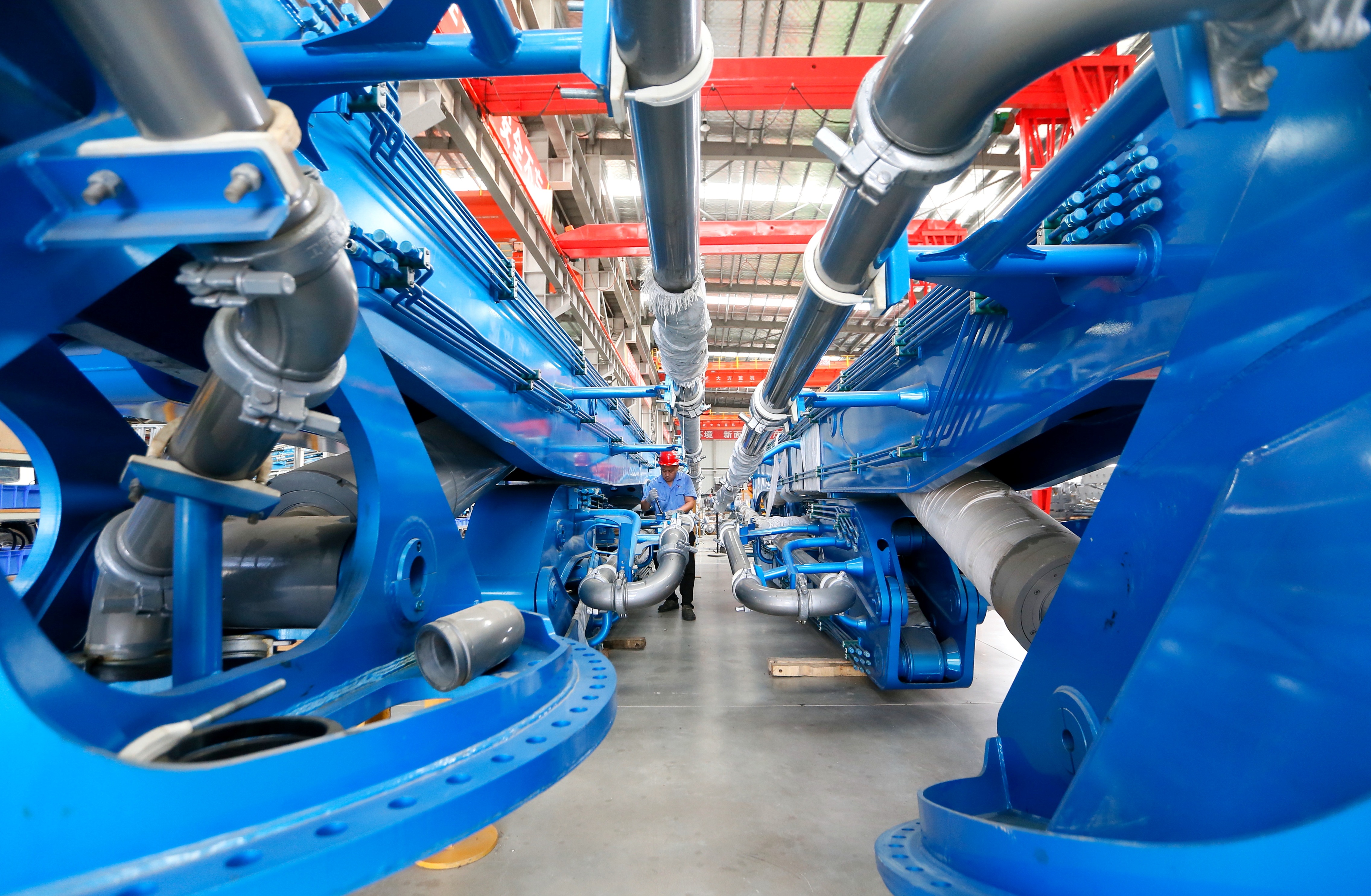 7月20日,青岛九合重工机械有限公司的员工在生产待出口的混凝土泵车臂架。梁孝鹏摄