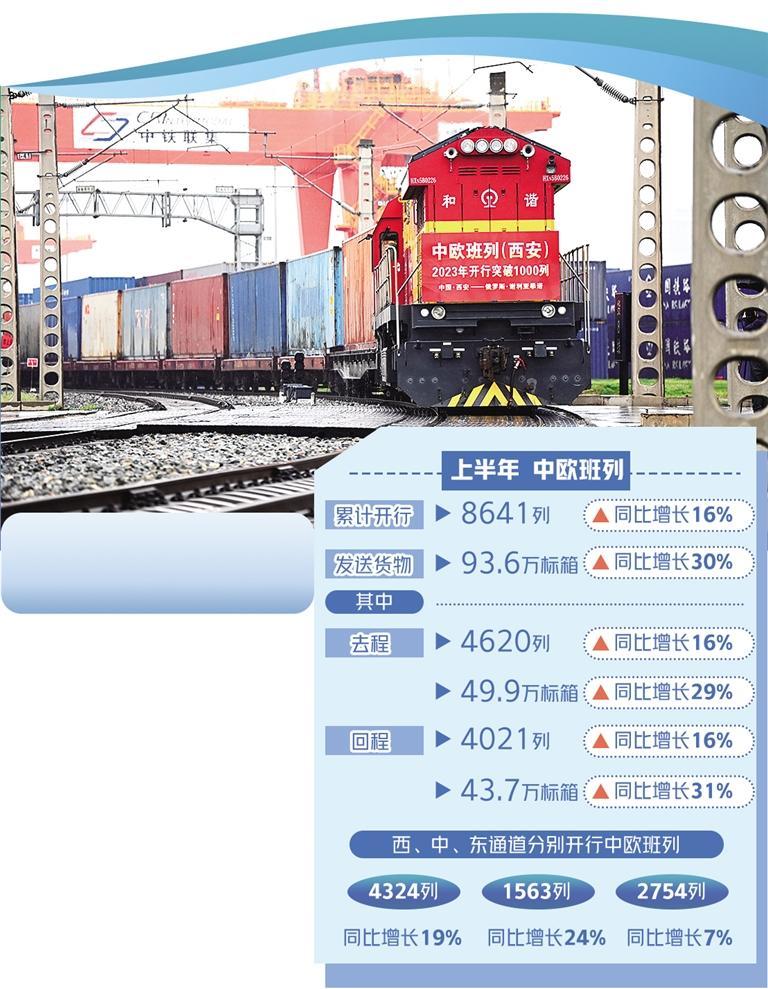 中国国家铁路集团有限公司数据显示,今年上半年,受益于外贸延续稳中向好态势,中欧班列跨境运输需求旺盛,开行数量强劲增长。累计开行8641列,发送货物93.6万标箱,同比分别增长16%、30%。其中去程4620列、49.9万标箱,同比分别增长16%、29%;回程4021列、43.7万标箱,同比分别增长16%、31%。