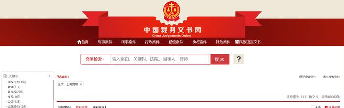 △ 以“上海宽娱”为关键词搜索,共检索出1331篇文书 图源:中国裁判文书网