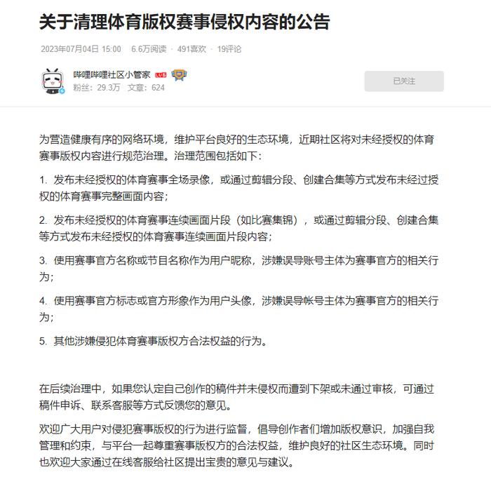△本月初,B站社区曾发布清理体育版权赛事侵权内容的公告 图源:官方