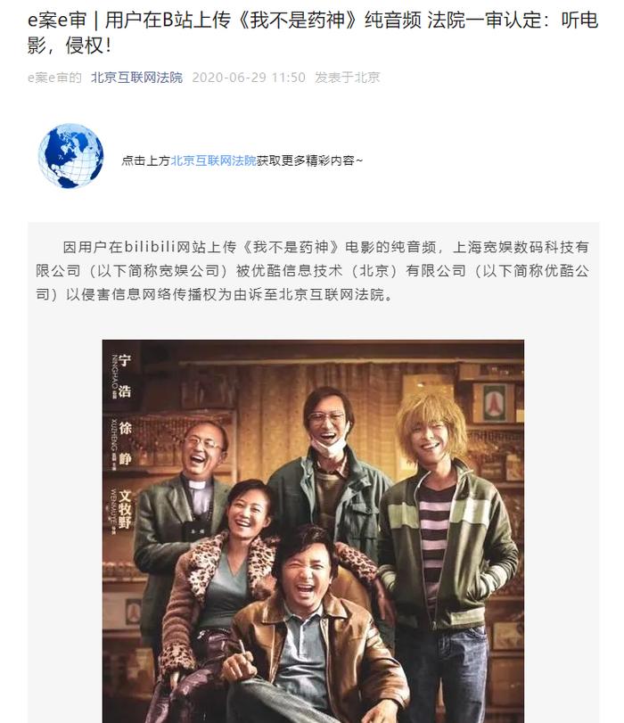 2020年6月29日,北京互联网法院官方公众号发布公告称,因用户在B站上传《我不是药神》电影的纯音频,上海宽娱数码科技有限公司被优酷信息技术(北京)有限公司以侵害信息网络传播权为由提起诉讼,北京互联网法院一审认定,上海宽娱应当知晓网络用户利用其网络服务侵害优酷公司信息网络传播权的行为,构成帮助侵权。