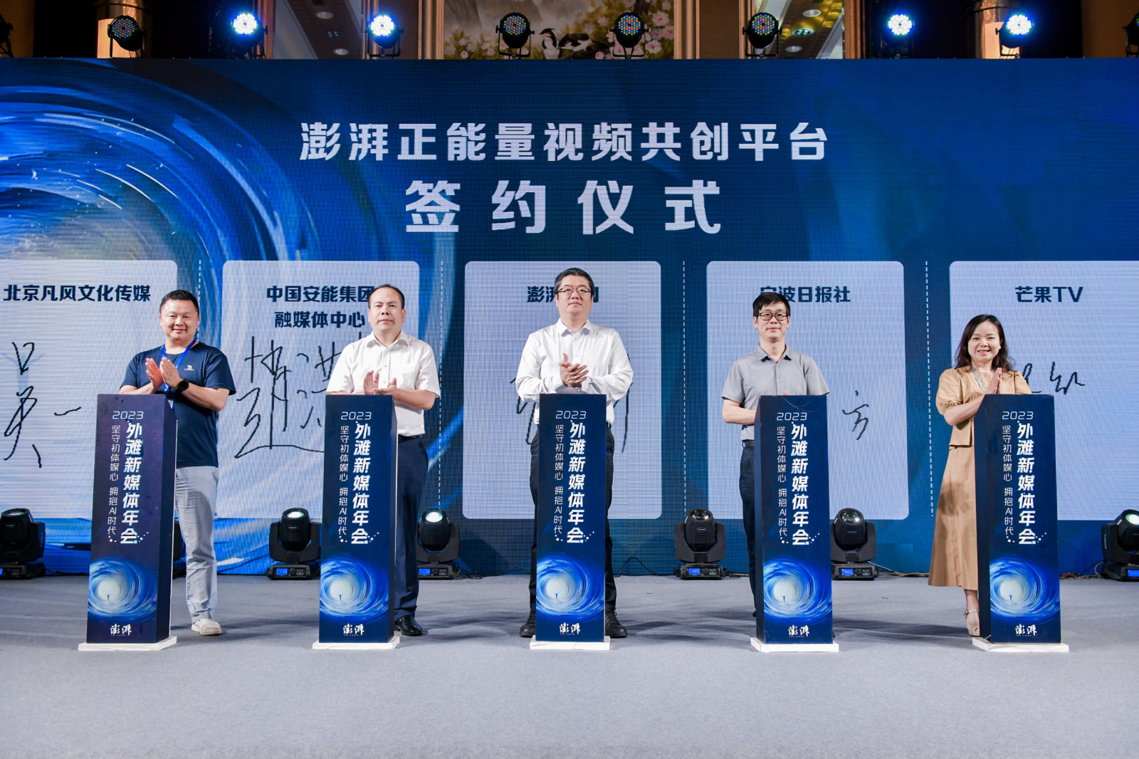 参加澎湃正能量视频共创平台签约仪式的嘉宾,包括宁波日报社副总编辑张伟方、中国安能集团党群工作部高级主管赵洪虎、芒果TV品牌推广中心副总经理陈红、北京凡风文化传媒有限公司董事长吴一一、澎湃新闻编委赵昀。