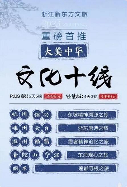 从路线设置及产品价格上看,根据“杭州新东方”微信公众号信息,浙江新东方文旅首推的“大美中华文化十线”产品共有两款,其中6天5晚的“PLUS版”售价为5999元;4天3晚的“轻量版”售价为3999元,包括“浙东唐诗之旅”“莲都寻根之旅”等。