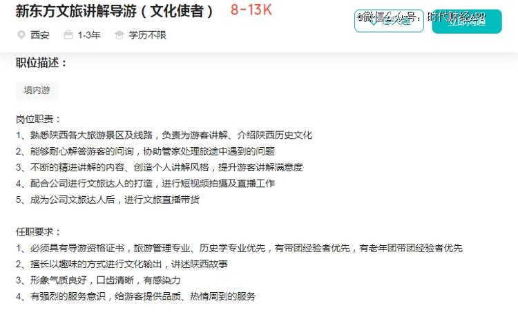 从人员配置上看,一方面,俞敏洪曾表示,希望“让新东方老师们成为热爱分享文化与知识的导游,带人们在行走的过程中感知中国文化。”另一方面,新东方部分地方学校已在对外招聘导游,如坐标西安市的新东方培训学校就在7月18日发布了一则文旅讲解导游招聘,并提及“有老年团带团经验者优先”。此外,该岗位的工作职责还包括“配合公司进行文旅达人的打造,进行短视频拍摄及直播工作”“成为公司文旅达人后,进行文旅直播带货”等。