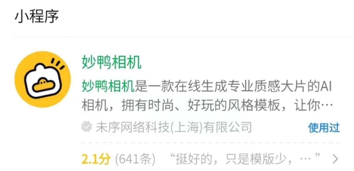 朋友大笑后解释:“你太OUT了吧?这是小程序生成的,只要9.9元,你值得拥有!”并发送来妙鸭相机的小程序链接。