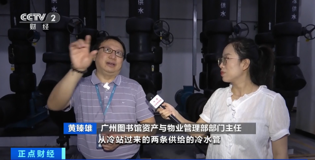广州图书馆资产与物业管理部部门主任黄臻雄:从冷站过来的两条供给的冷水管,进来的温度恒定在2℃左右,出水的温度大概在7℃,整体温差在4℃以上。我们买冷水,费用比自建冷源要低很多,同时会节省大量用电。