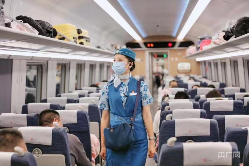 中老铁路国际旅客列车乘务员正在巡视车厢(央广网发杨紫轩摄)