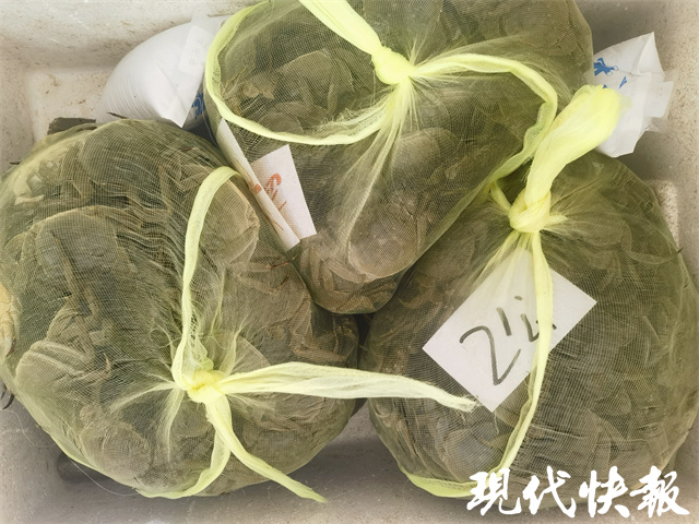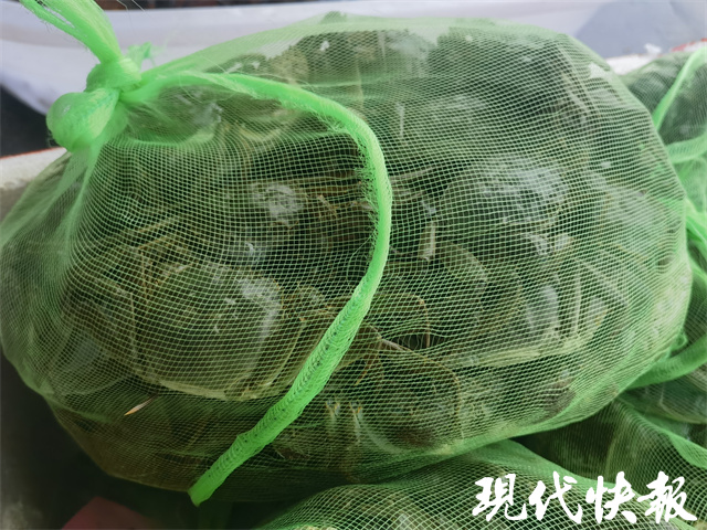 在水产品经营区,大概有六家商户售卖“六月黄”,它们被按不同规格成袋摆放,一只只青褐色的螃蟹张牙舞爪,在网袋里争相爬动,看起来活力十足。相比于成熟期的大闸蟹,刚进入青年期的“六月黄”个头并不算大,但一个个鲜活的螃蟹,着实令人垂涎欲滴。