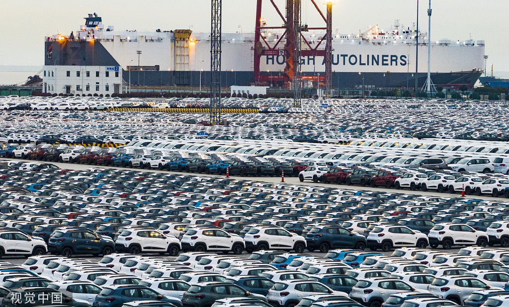 2023年5月24日,苏州,太仓港海通(太仓)汽车码头有限公司,一批4396辆汽车即将通过“礼诺亚洲”号汽车滚装轮出口欧洲市场。视觉中国资料图