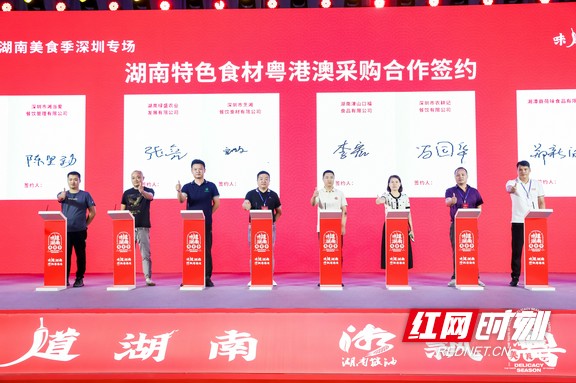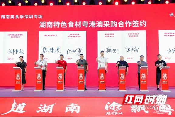 包括聪厨与湘当爱、津山口福与农耕记、易俗河老铁与芙蓉楼、山枯佬与烹湘、荷味与爱碗亭、掌勺兄弟与小辣椒、加加与2046、龙牌与湘超鲜等16家企业签订了湖南特色食材粤港澳专属采购合作签约,合同金额超7000万元。