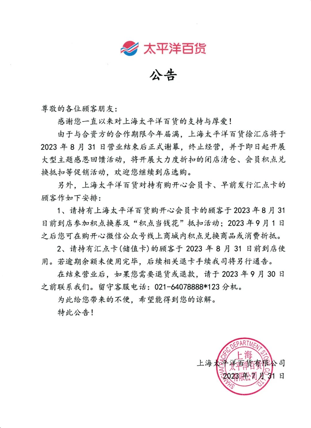 该公告还写道,太平洋百货徐汇店即日起开展大型主题回馈活动,将开展大力度折扣的闭店清仓、会员积点兑换抵扣等促销活动。