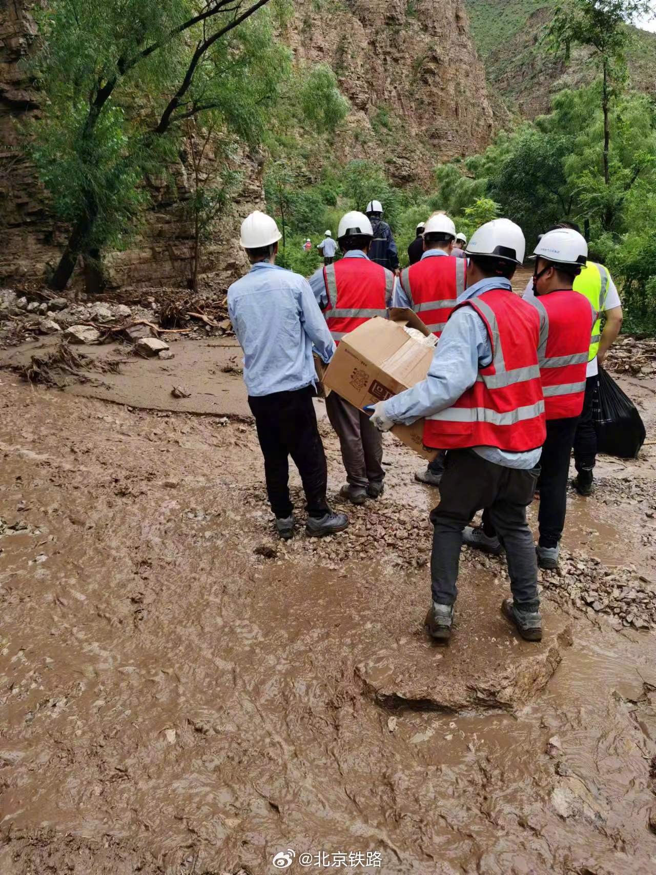 国铁北京局29名党员突击队员在队长刘亚军的带领下,面对沿途山体塌方、泥沙积水毫不畏惧,踏着多处厚达30厘米以上淤泥,肩扛手提食品及饮用水等生活物资,于今日10时左右,首先运抵停靠在沿河城火车站的K1178次列车上。微博@北京铁路图