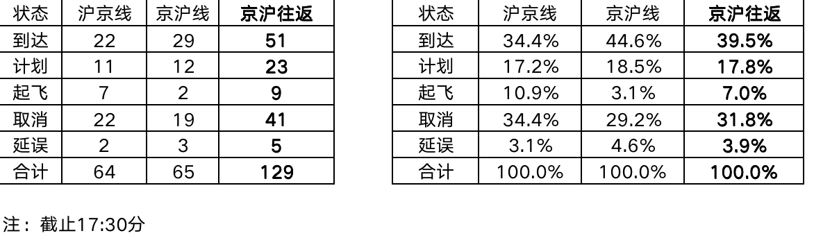 8月1日截至17时20分京沪航班运行情况。数据来源于“航班管家”