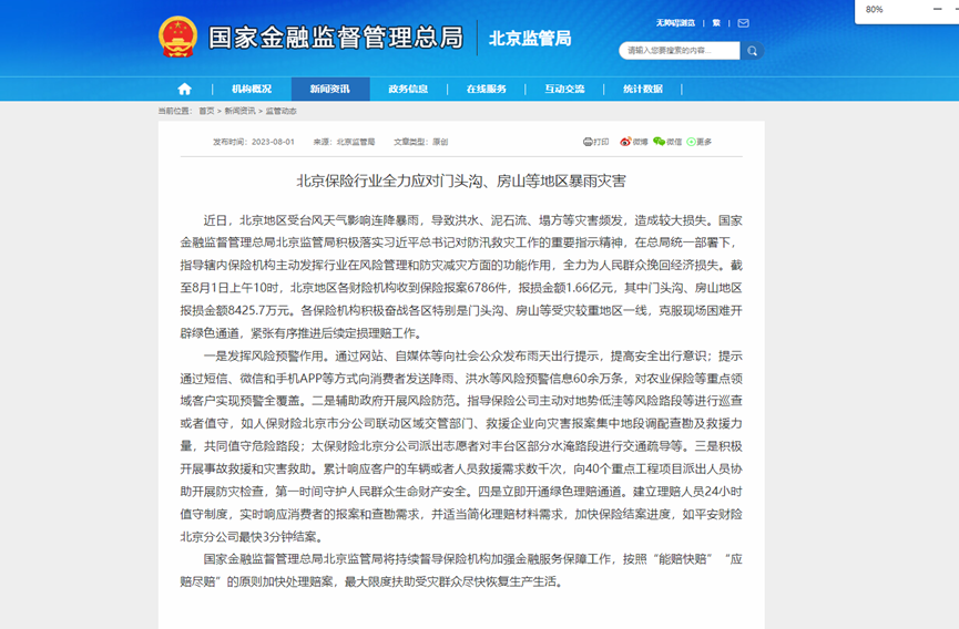 国家金融监督管理总局北京监管局也在7月31日发布提示:车险综合改革启动后,车辆损失保险保障范围已涵盖暴雨、台风等自然灾害造成的损失。如车辆发生相关损失,请及时拨打保险公司报案电话,确认是否投保相关保险,并在工作人员的指引下办理后续理赔手续。