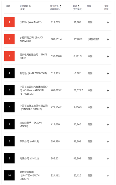 具体来看,中国营业收入前十的企业分别是5300.09亿美元的国家电网、4830.19亿美元的中国石油、4711.54亿美元的中国石化、3058.85亿美元的中国建筑、2225.35亿美元的鸿海精密、2147.66亿美元的工商银行、2027.53亿美元的建设银行、1870.61亿美元的农业银行、1815.66亿美元的中国平安、1738.34亿美元的中国中化。